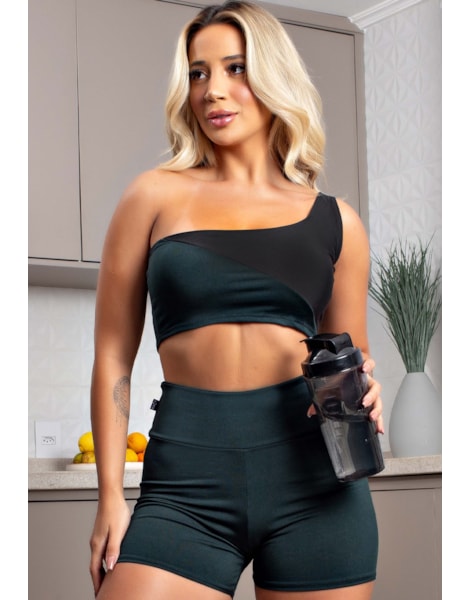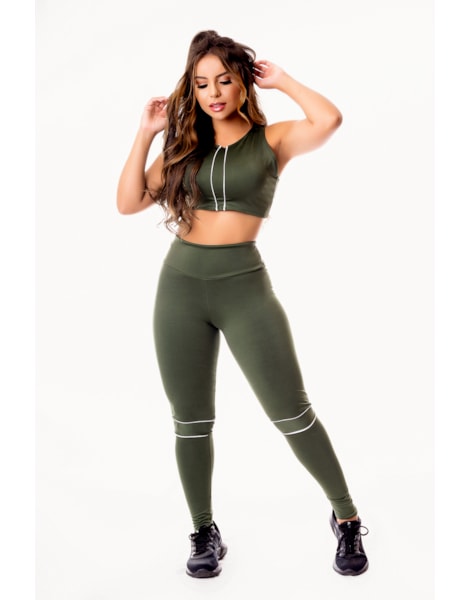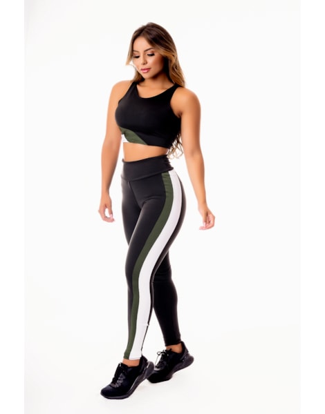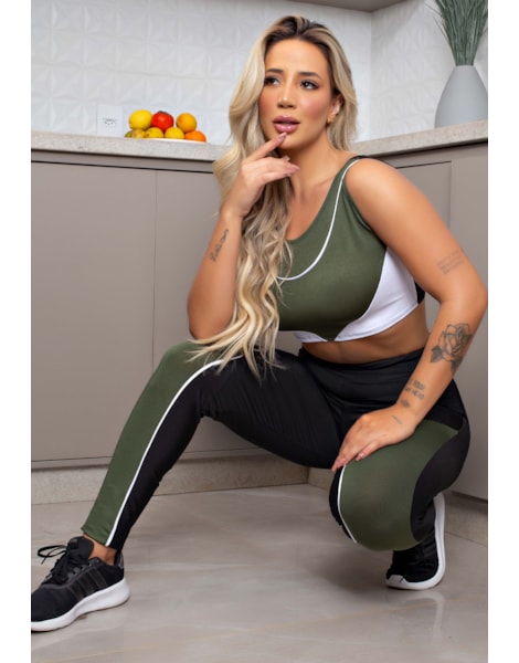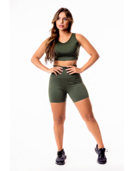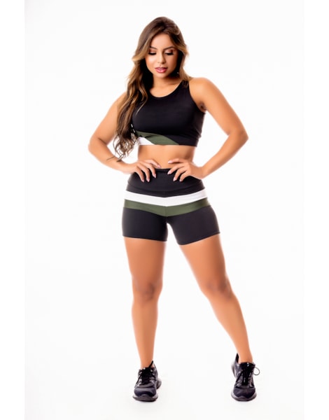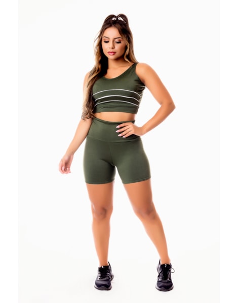 Conjunto Fitness Feminino Short Verde Militar Cintura Alta e Cropped Regata com Detalhes Pretoe Branco Academia REF: CSV13